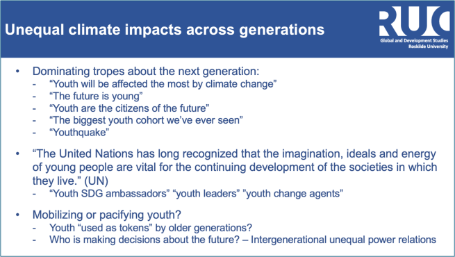 Our own contribution to the panel focused on ‘Global Imaginaries, Intergenerational Relations and Youth Mobilization in Times of Climage Change’. We addressed the problem of how the ‘blame’ for and impacts of climate change across different generations are represented by International, Tanzanian and Danish online media, and what purpose such global imaginaries can serve. One product of these imaginaries is the idea of a global generation of youth coming together across global divides to solve climate challenges. We asked whether we can meaningfully speak of an existing ‘global generation of youth’, and how youth actually relate locally, in different parts of the world, to solving worldwide challenges.