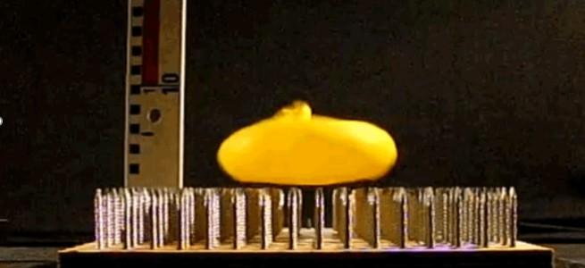 Tina Hecksher skalerede sammen med sine studerende Jonas Andersen Bro, Kasper Jensen og Alex Nygaard Larsen forsøget til makroskala. Her blev vanddråben erstattet af en vandballon og søjleoverfladen af en sømmåtte. Umiddelbart skulle man tro, at vandballonens tynde overflade vil gå i stykker ved kollisionen med de spidse søm. I stedet opfører vandballonen sig akkurat som vanddråben i det oprindelige forsøg ved først at flade ud som en pandekage, mens ballonens overflade strækkes ned i rummet mellem sømmene. Den udspændte overflade trækker sig derefter sammen og vandballonen slynges tilbage op i luften, mens den stadig er helt flad. Det er først i luften, at vandballonen går fra sin pandekageform til sin oprindelige form – ligesom vanddråberne.
