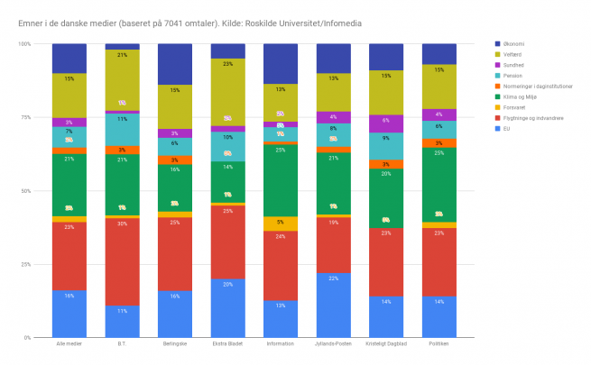Der er tabere blandt emnerne, og der er vindere. De emner, der løber med absolut mest omtale, er flygtninge og indvandrere, velfærd og klima. Men selv inden for de emner, der får meget omtale, er der stor forskel på, hvor meget de enkelte medier behandler emnerne.